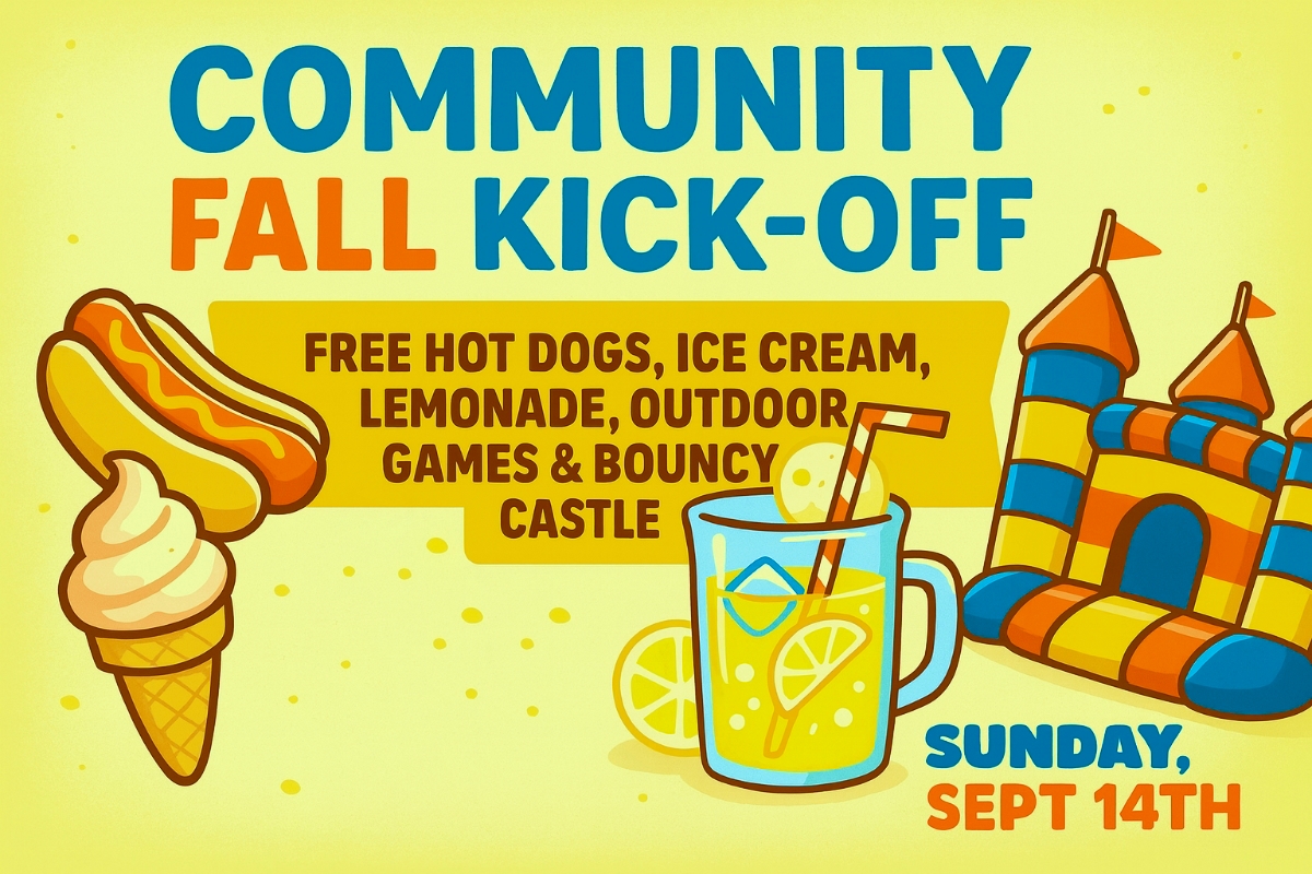Everyone in the neighbourhood is invited to join us after church for FUN TIMES with free hotdogs, lemonade, ice cream, outdoor games, and bouncy castles!